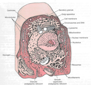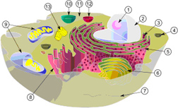 Schematic of typical animal cell, showing sub-cellular components. Organelles: (1) nucleolus (2) nucleus (3) ribosome (4) vesicle (5) rough endoplasmic reticulum (ER) (6) Golgi apparatus (7) cytoskeleton (8) smooth ER (9) mitochondria (10) lysosome (11) cytoplasm (12) peroxisome (13) centrioles